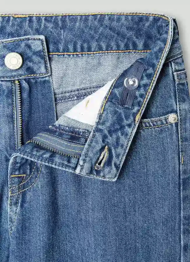 – Rigid denim fabric with medium blue stone wash