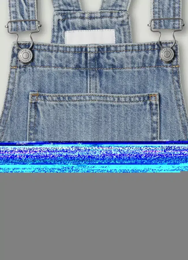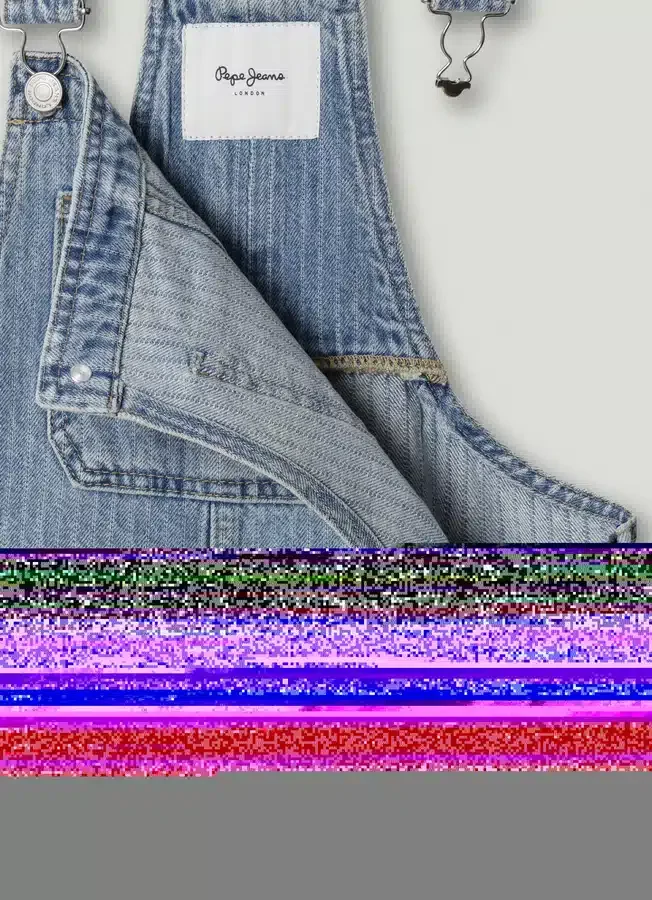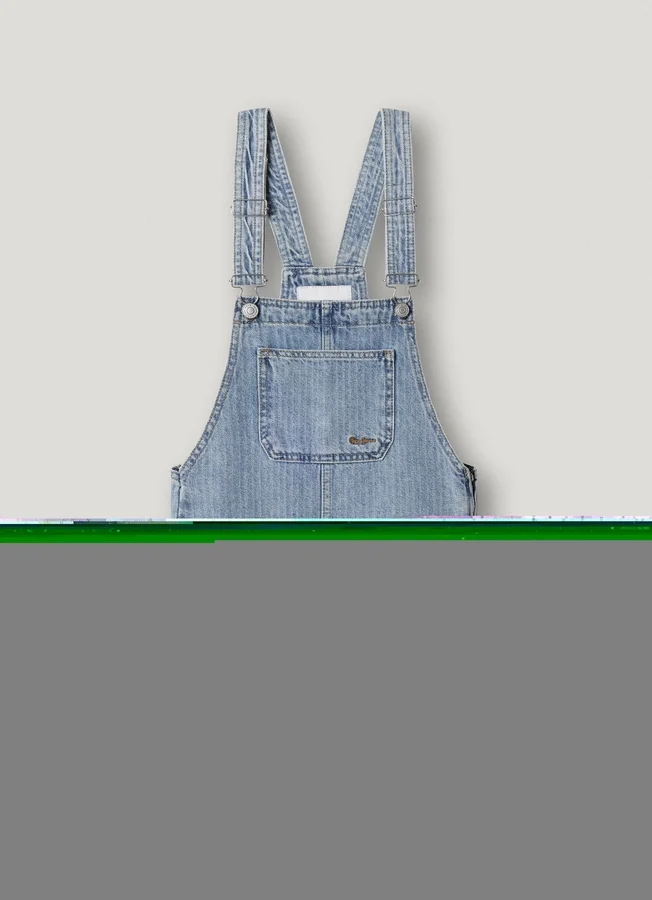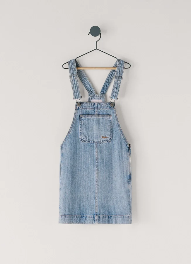 – Short dungaree-style dress in rigid denim fabric