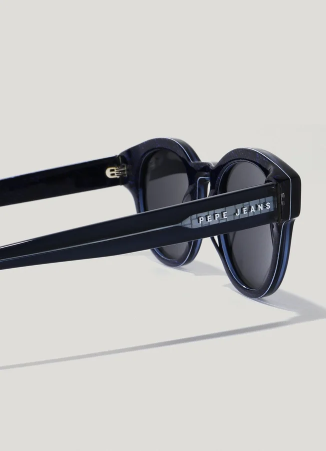 – Round sunglasses with soft curves in their silhouette – Frame in renewable acetate with a dark denim color front – Temples with elegant metallic details – Polarized lenses in blue tones with CAT 3 category – 100% UV protection and impact resistance – Lenses with high resistance to abrasion and scratches – PEPE JEANS logo engraved in golden letters on the temples – Includes case made from recycled denim fabric – Dimensions: 50 mm lenses, 22 mm bridge, and 145 mm temples