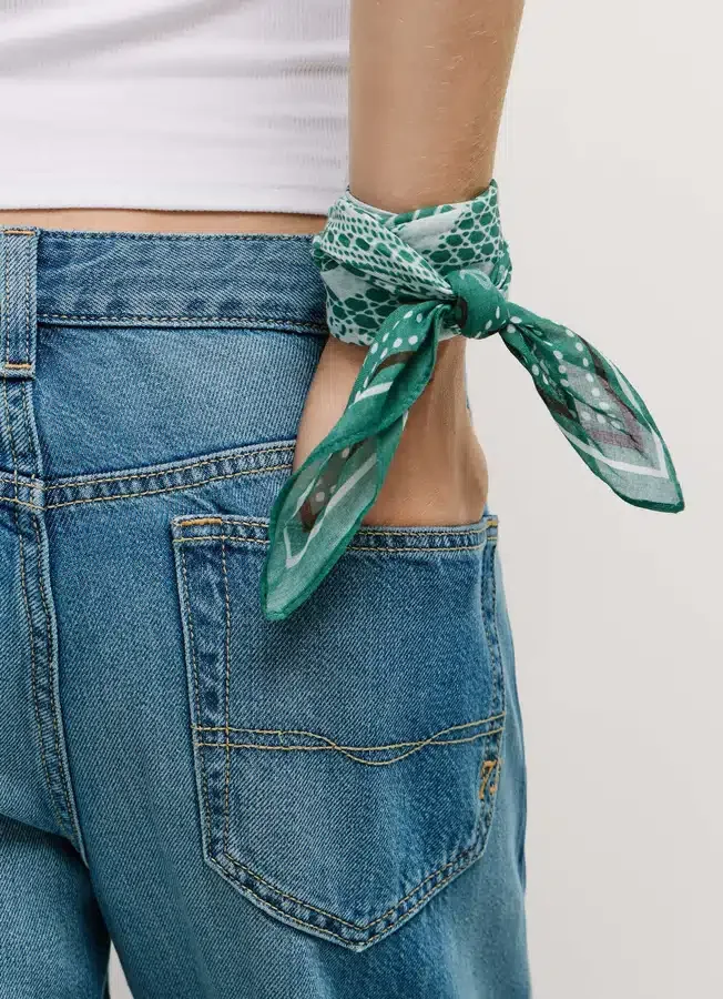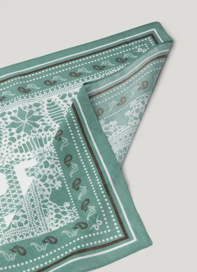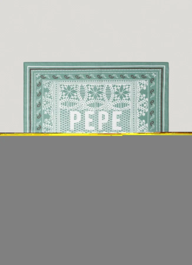 – Scarf made of 100% cotton twill – Square design – Abstract print with paisley details in contrast colors – Maxi size PEPE JEANS logo in the center – Finely finished edges with matching stitching