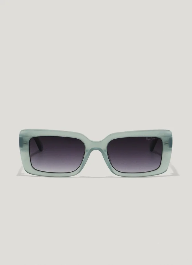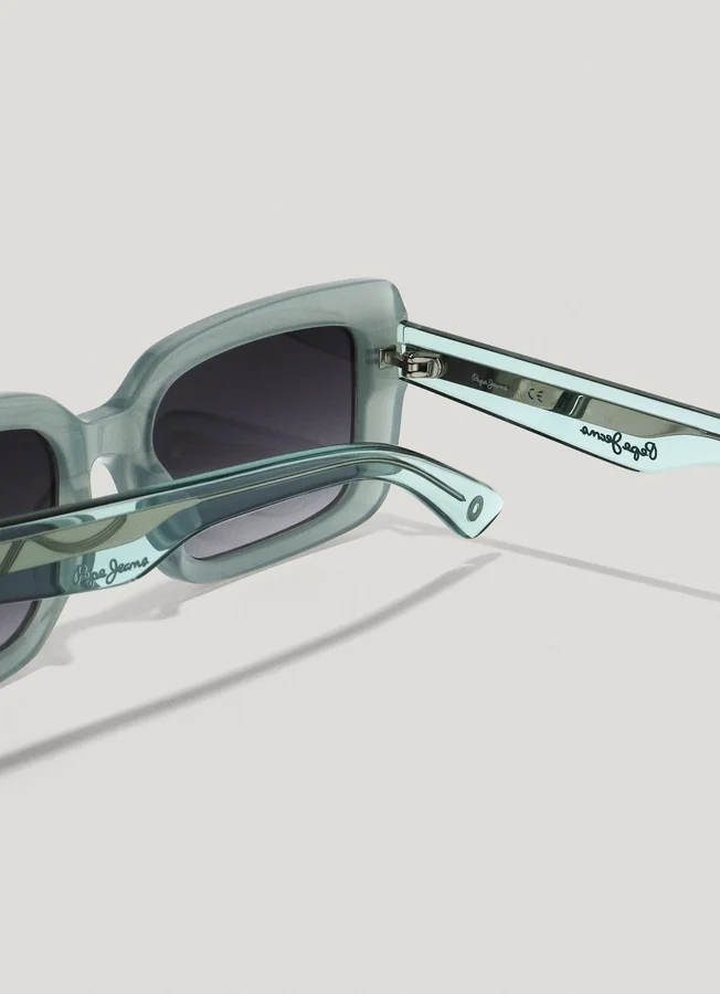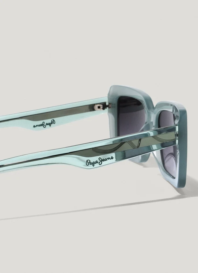 – Geometric sunglasses with a rectangular shape – Acetate frame in light aquamarine tones – Translucent temples with custom-designed internal metal rod – Brown-toned lenses with CAT 3 category – 100% UV protection and impact resistance – Lenses with high resistance to abrasion and scratches – Subtle PEPE JEANS logo engraved in golden letters on the temples – Dimensions: 53 mm lenses, 19 mm bridge, and 145 mm temples