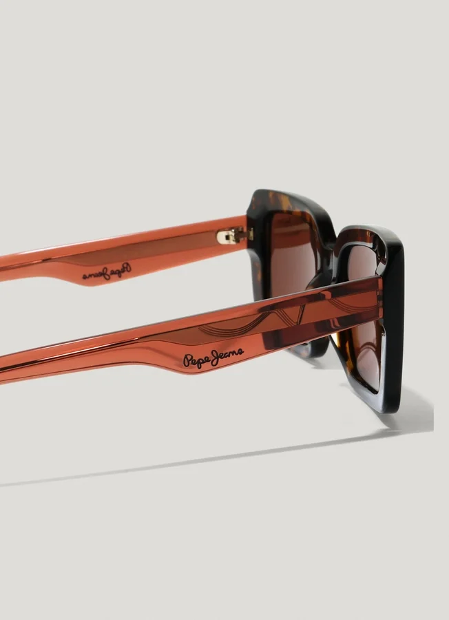 – Geometric sunglasses with a rectangular shape – Acetate frame with tortoiseshell-inspired design – Translucent temples with custom-designed internal metal rod – Brown-tinted lenses with CAT 3 category – 100% UV protection and impact resistance – Lenses with high resistance to abrasion and scratches – Subtle PEPE JEANS logo engraved in golden letters on the temples – Dimensions: 53 mm lenses, 19 mm bridge, and 145 mm temples