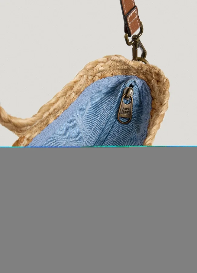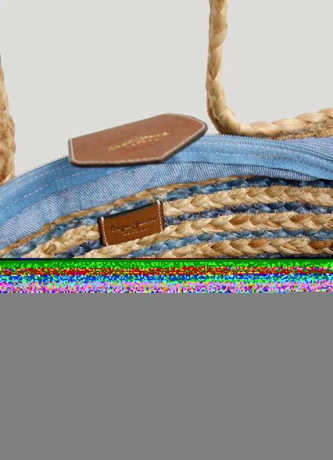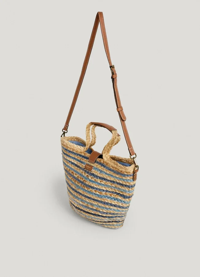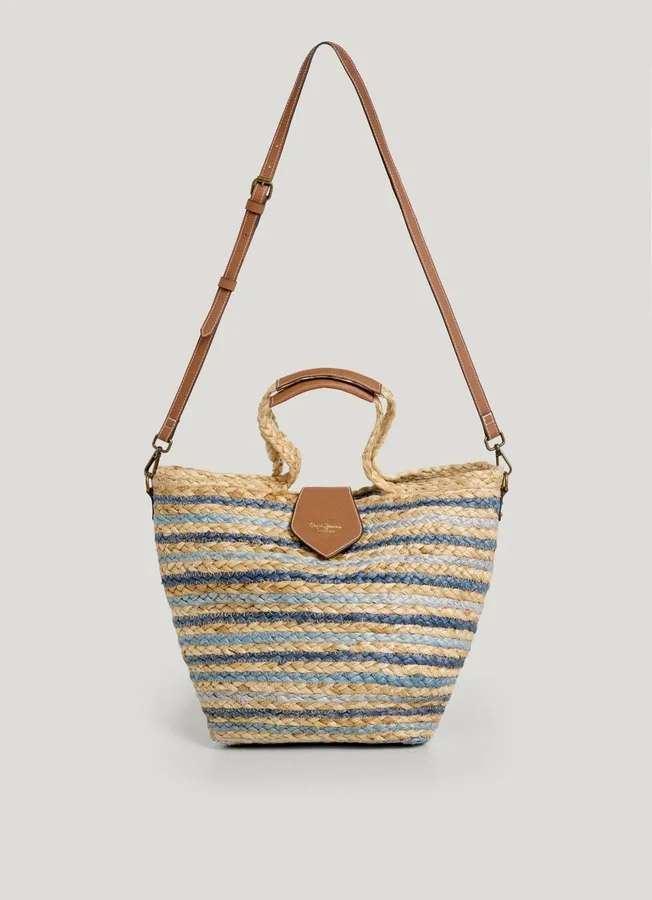 – Shopper bag made of natural jute – Exterior flap closure with magnetic button – Single compartment with zip closure – Fine stripe design all over – Short handles with leather effect grips – Detachable and adjustable shoulder strap – PEPE JEANS logo in golden letters on the flap – Logo patch on the back – Dimensions: 46 cm x 9 cm x 26 cm