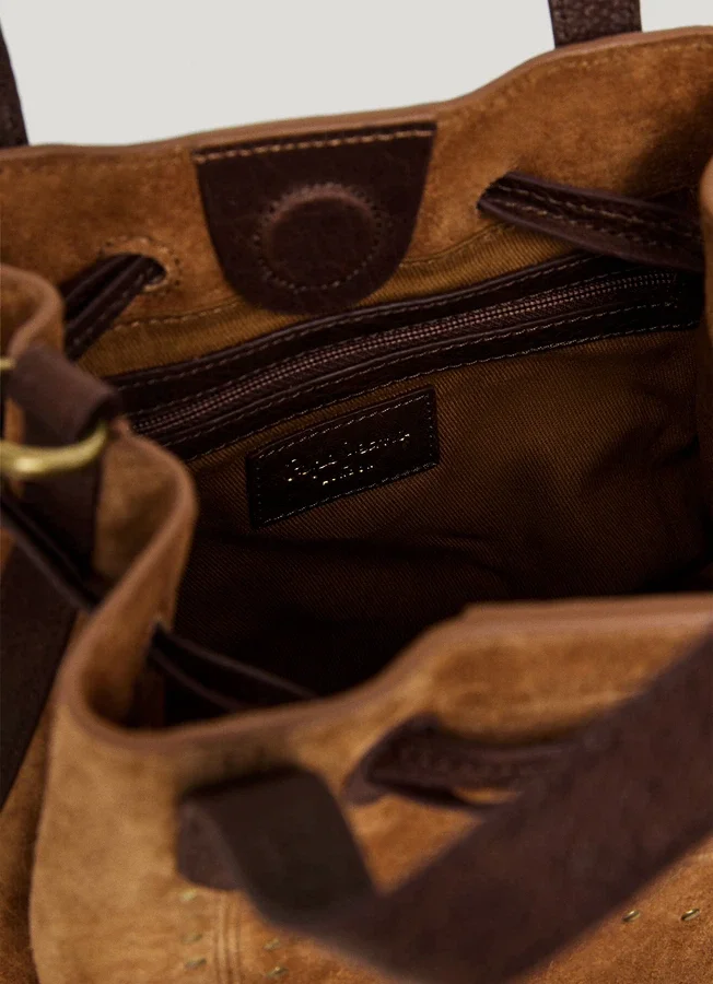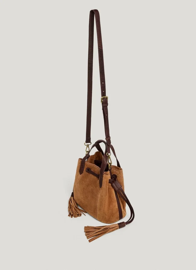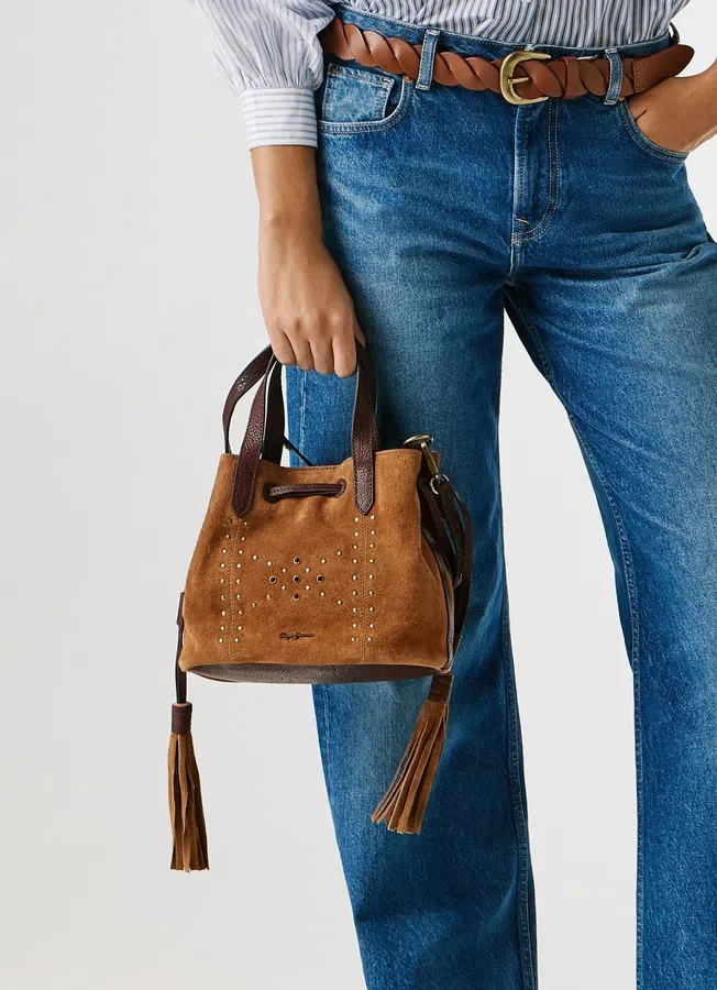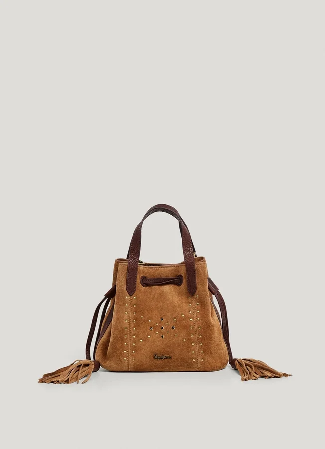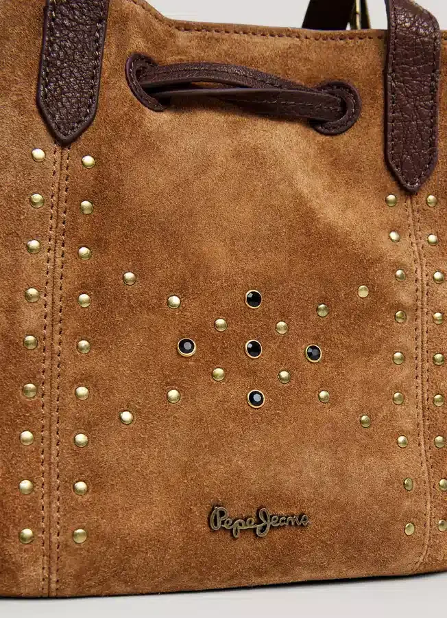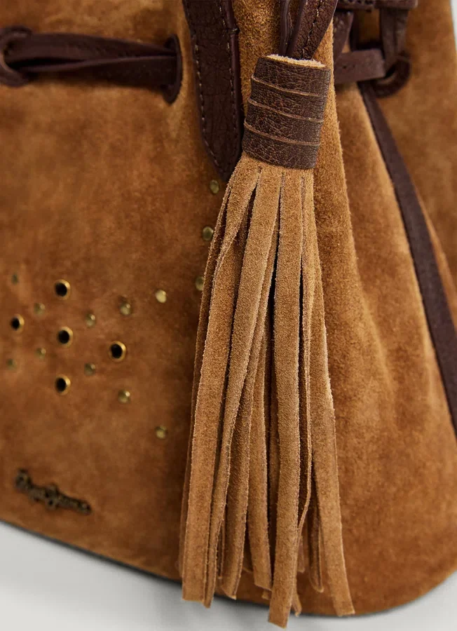 – Bucket bag made of cowhide suede – Leather drawstring closure with decorative fringes – Gold studs and crystal details on the front – Short leather handles for carrying as a handbag – Detachable and adjustable shoulder strap – Interior pocket with zip closure – Metallic PEPE JEANS logo on the front – Dimensions: 22 cm x 11.5 cm x 19.5 cm