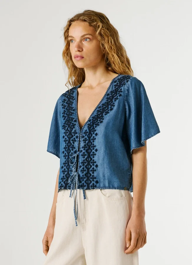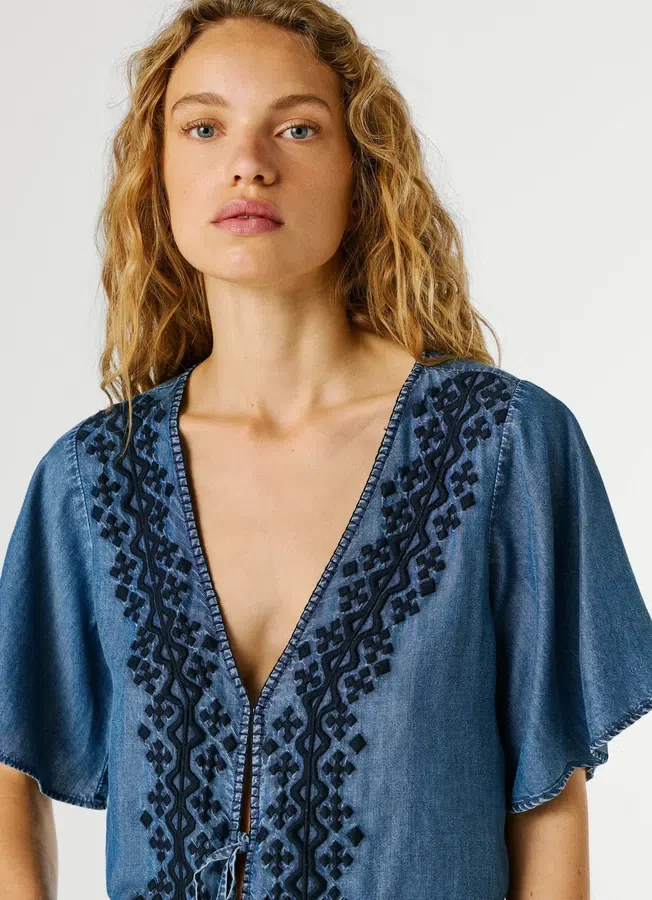 – Geometric contrast embroidery around the placket