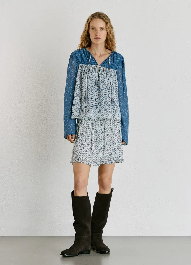 – All-over floral print with color block design