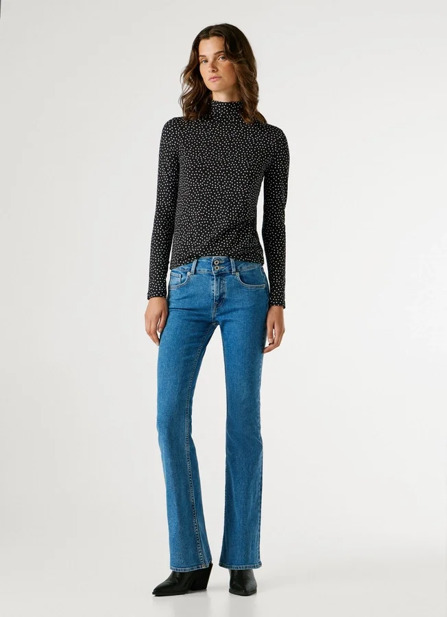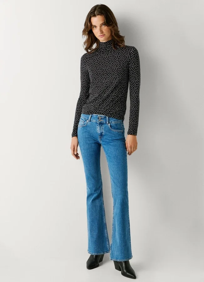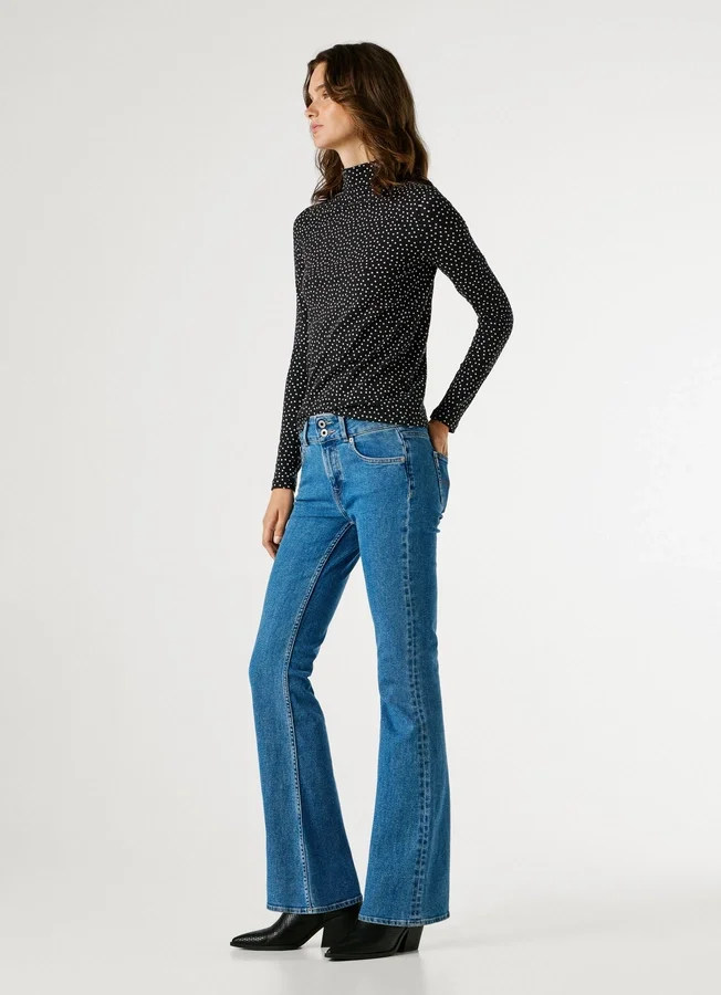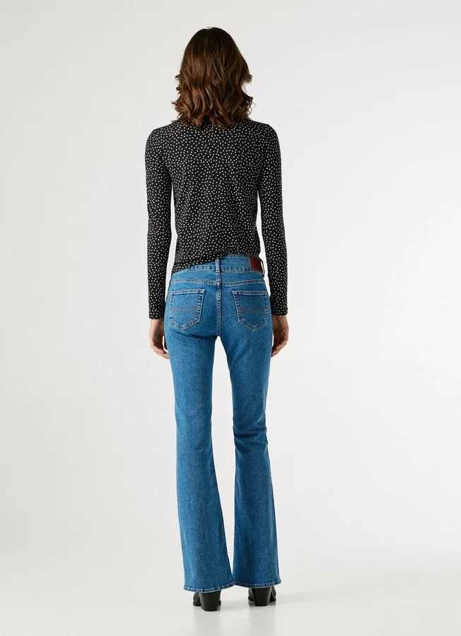 – Flare fit jeans. A close-to-body fit that widens from the knee down