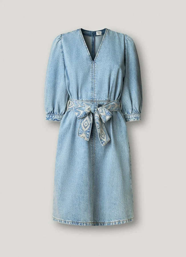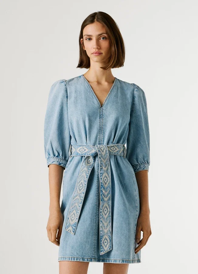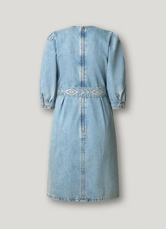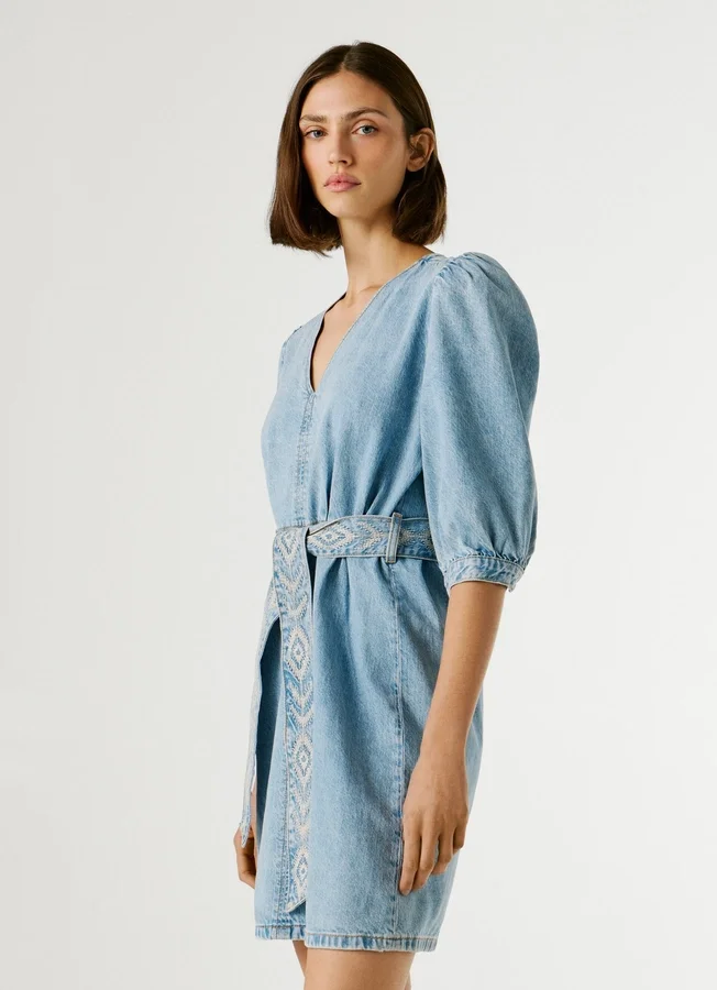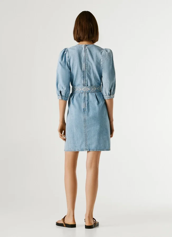– Short dress in rigid denim fabric