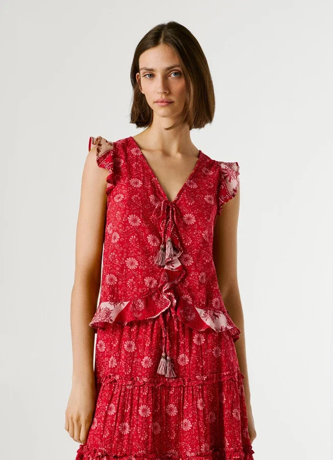 – V-neck with adjustable tie at the neckline