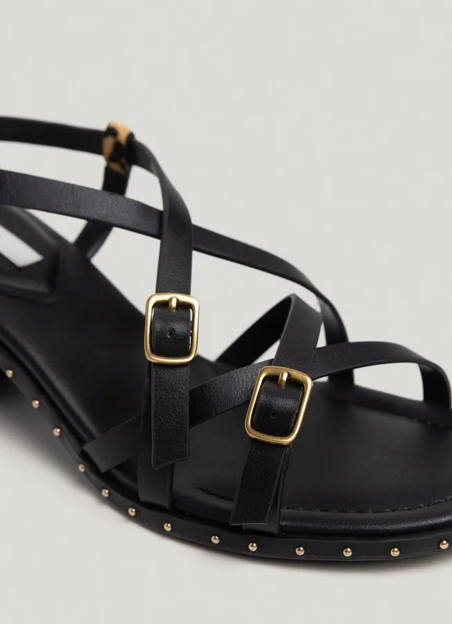 – Multiple crossed straps with metal buckles